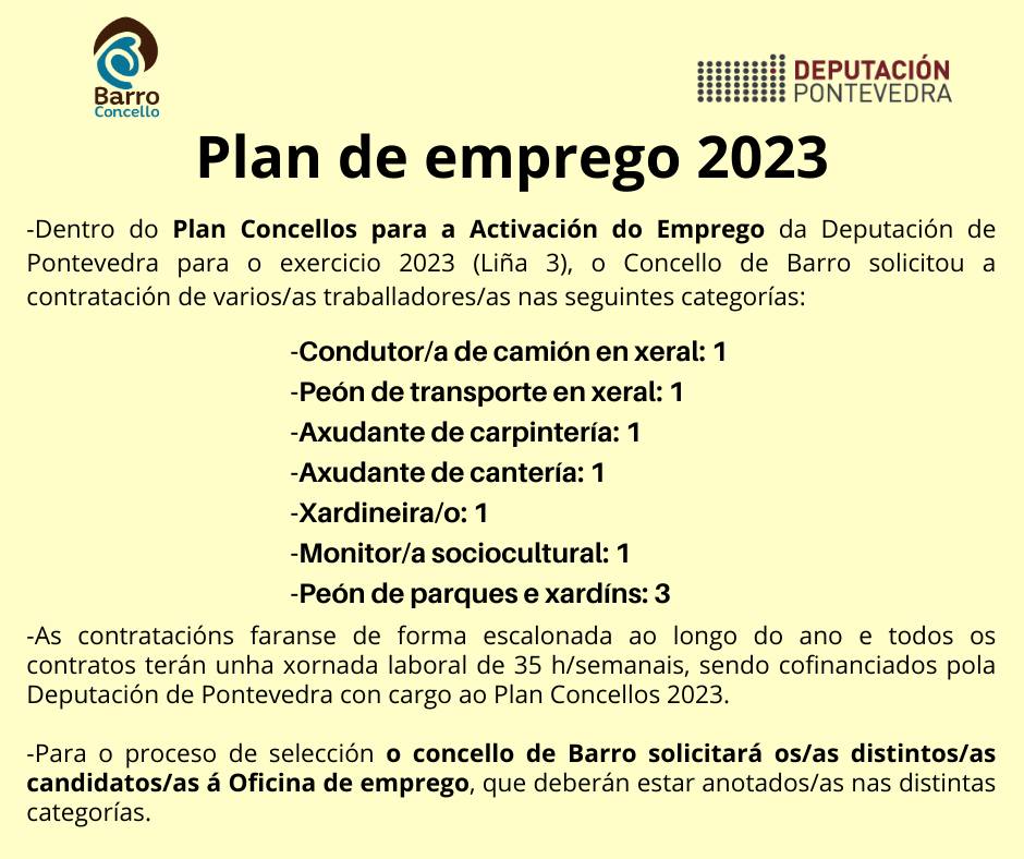 𝗣𝗹𝗮𝗻 𝗱𝗲 𝗲𝗺𝗽𝗿𝗲𝗴𝗼 𝟮𝟬𝟮𝟯 Para o proceso de selección o concello de Barro solicita os/as distintos/as candidatos/as á Oficina de emprego, que deberán estar anotados/as nas distintas categorías